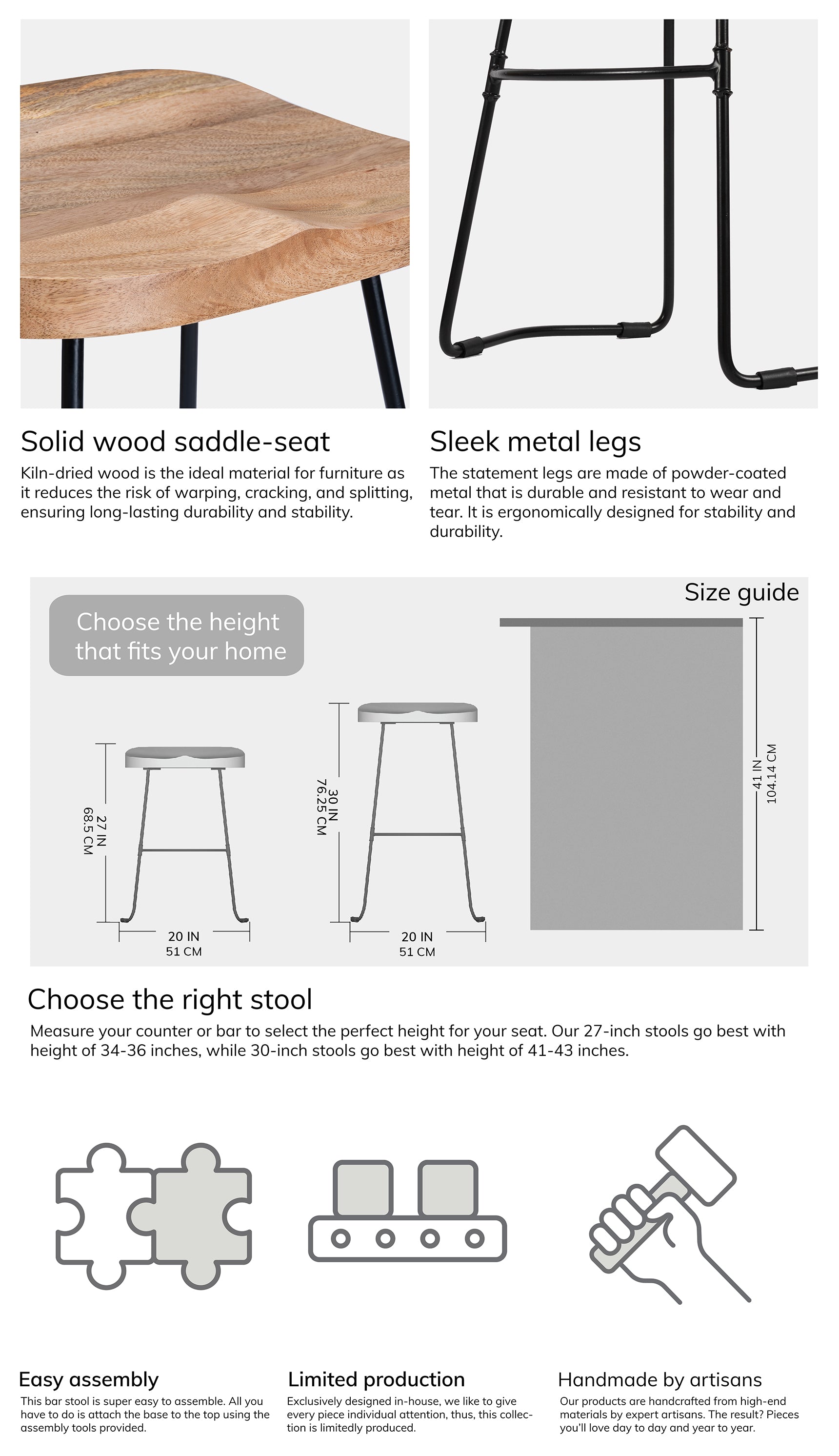 From morning breakfasts to Friday night drinks, this counter stool is here to make things stylish. Sleek metal legs combine with natural mango wood to bring design-focused beauty to your homes. Comfortable and right on trend, it embodies modern curves. The saddle seat and sculptural powder-coated legs, complete with a footrest are ergonomic details that make it a perfect option for guests to perch on as you prepare your signature dish. Handmade by skilled craftsmen, it is a winning addition to your kitchen counters.