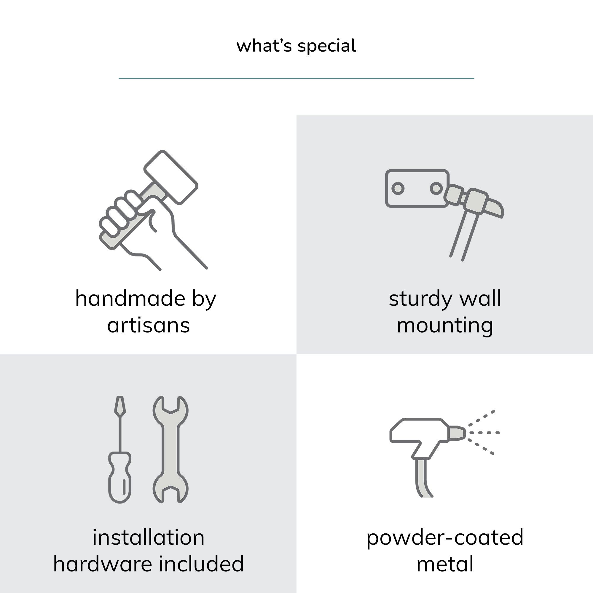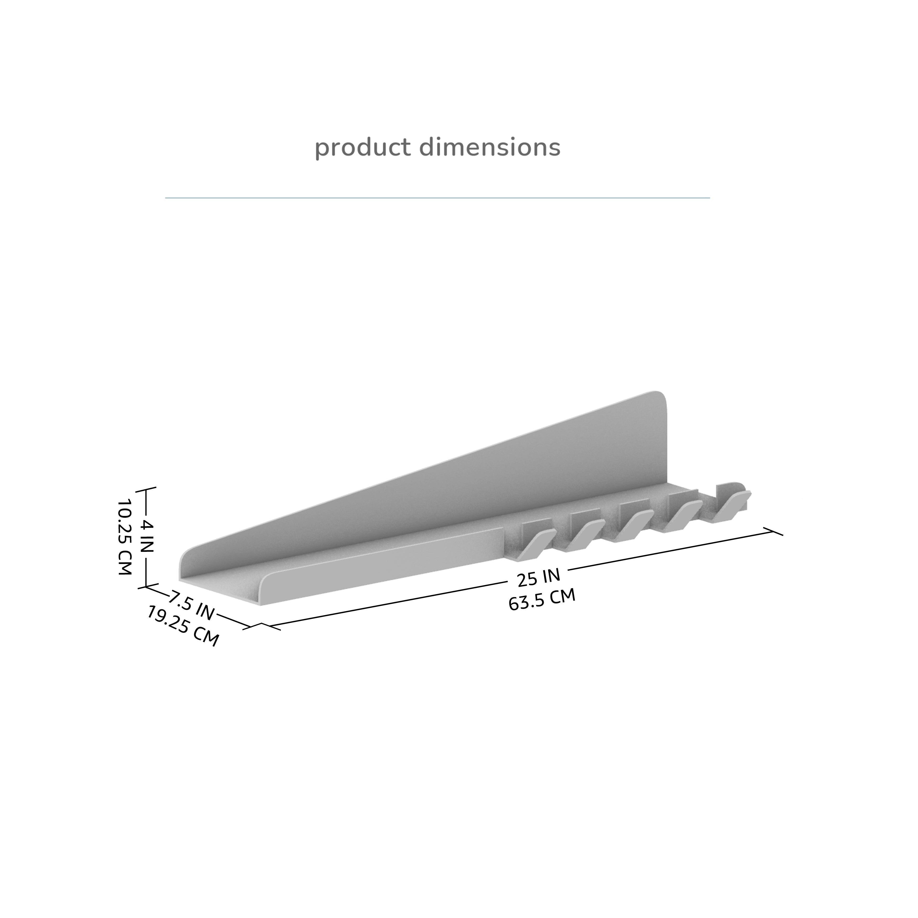 Clean lines, subtle asymmetry & sculptural charm - this shelf is inspired by the art of Origami. Made using powder coated metal it features subtly asymmetrical back & five hooks for practical storage. Smooth, curved corners not only elevate the look but makes it safer and more user-friendly too. A modern addition for your space, style it in your entryway or mudroom!