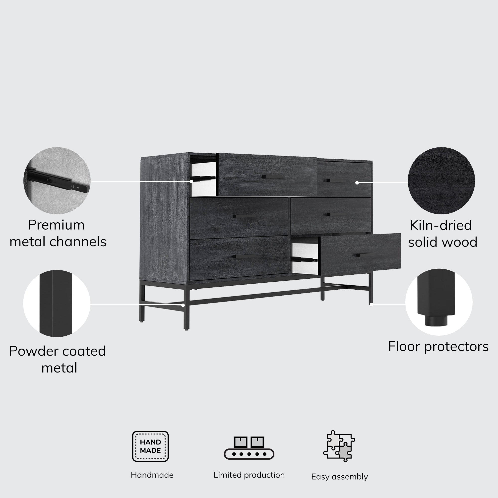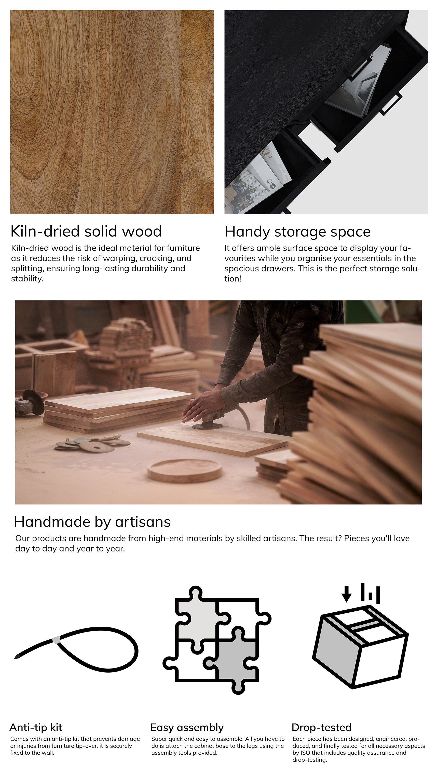 Storage can be practical and stylish; this chest of drawers shows you how. Infusing Scandinavian and industrial elements, this piece is here to make a statement. Note the clean lines and sleek metal legs. So chic. Handmade by artisans from solid mango wood, it features stunning wood grain patterns. Tuck your things inside the spacious drawers to keep clutter at bay. This is the perfect storage solution.