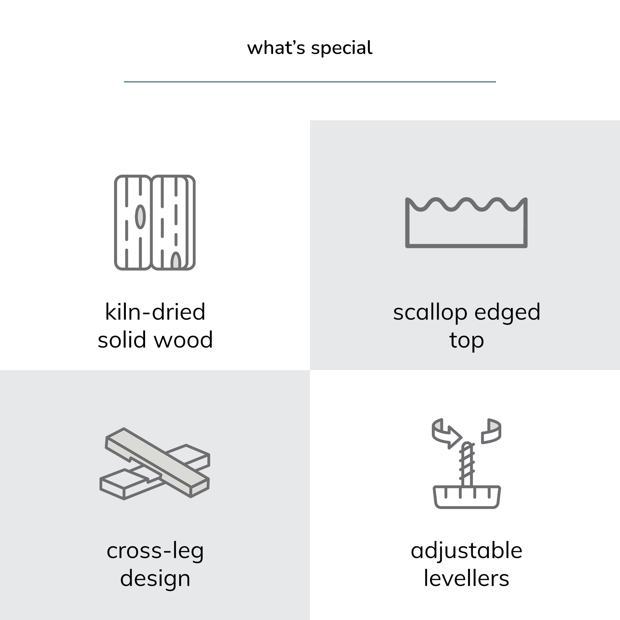 Stunning from every angle - our scalloped end table piques visual interest! Made using solid wood, this piece showcases a beautifully scalloped top. Its angular crossed legs add a touch of sophistication to any room. Compact yet striking, it complements a variety of design styles effortlessly. Easy and accessible - it assembles in just two simple steps!