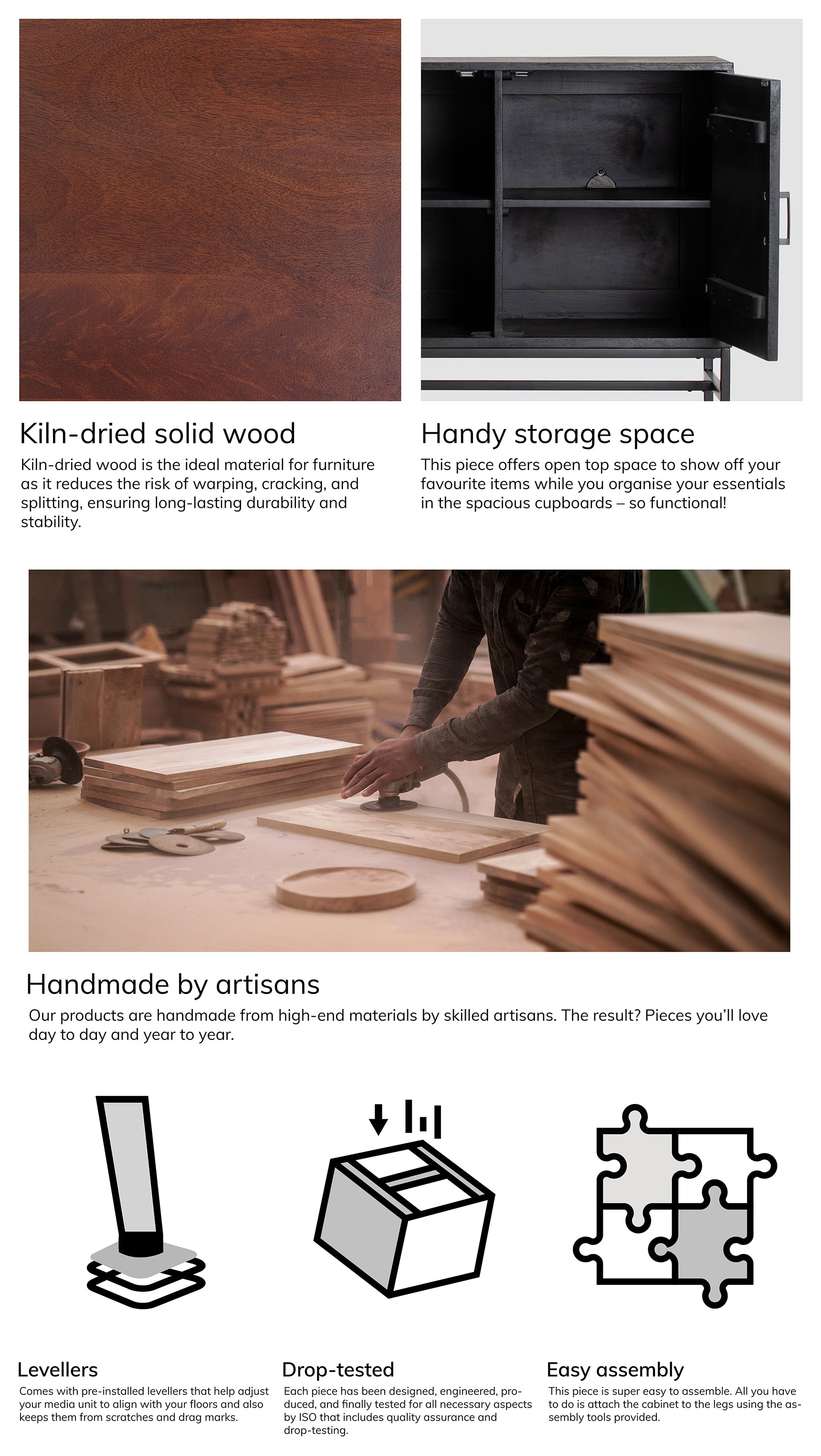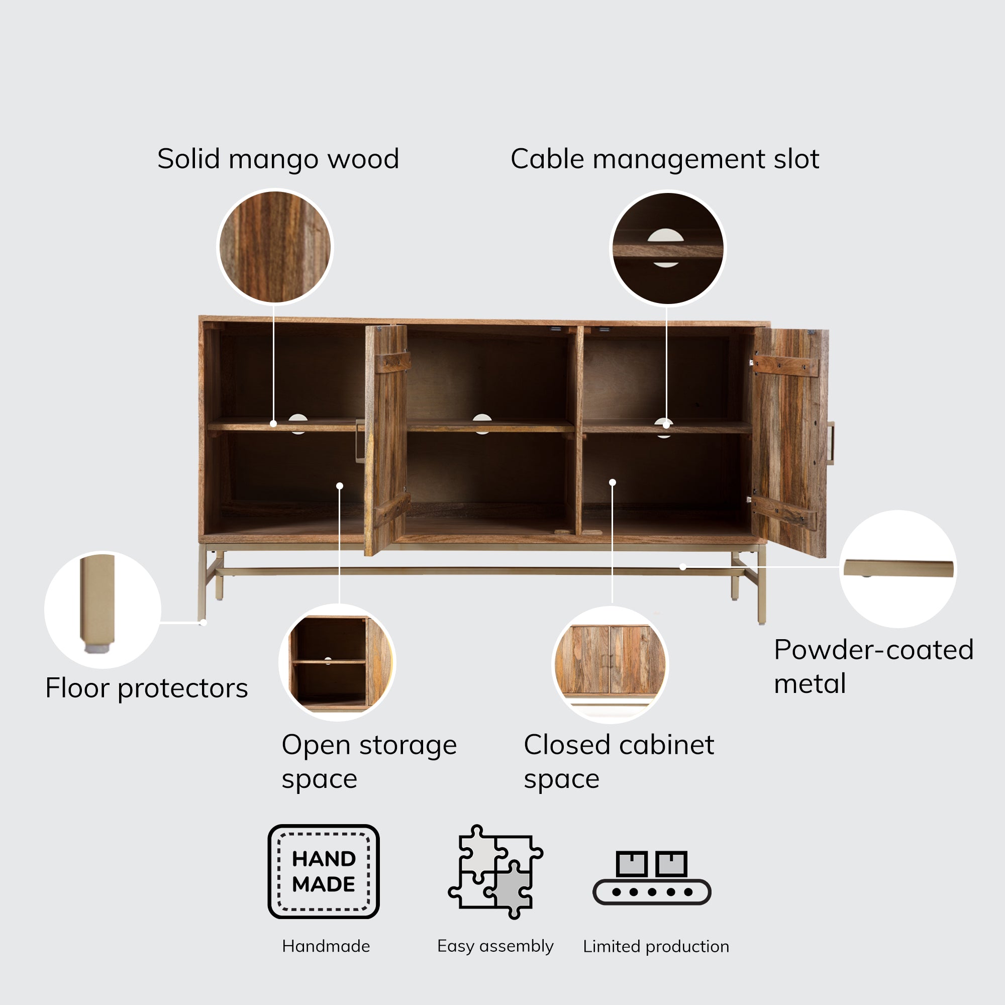 Such a looker! Clean lines, solid mango wood, space for all your tech- this media unit checks all the boxes. The open storage is perfect for your display-worthy pieces, while the spacious cabinet will hide away your clutter. Tangled wires killing your décor vibe? Check out all the cable management slots to do the sorting for you! Made of solid wood and powder-coated metal, this media unit is handcrafted by skilled artisans.