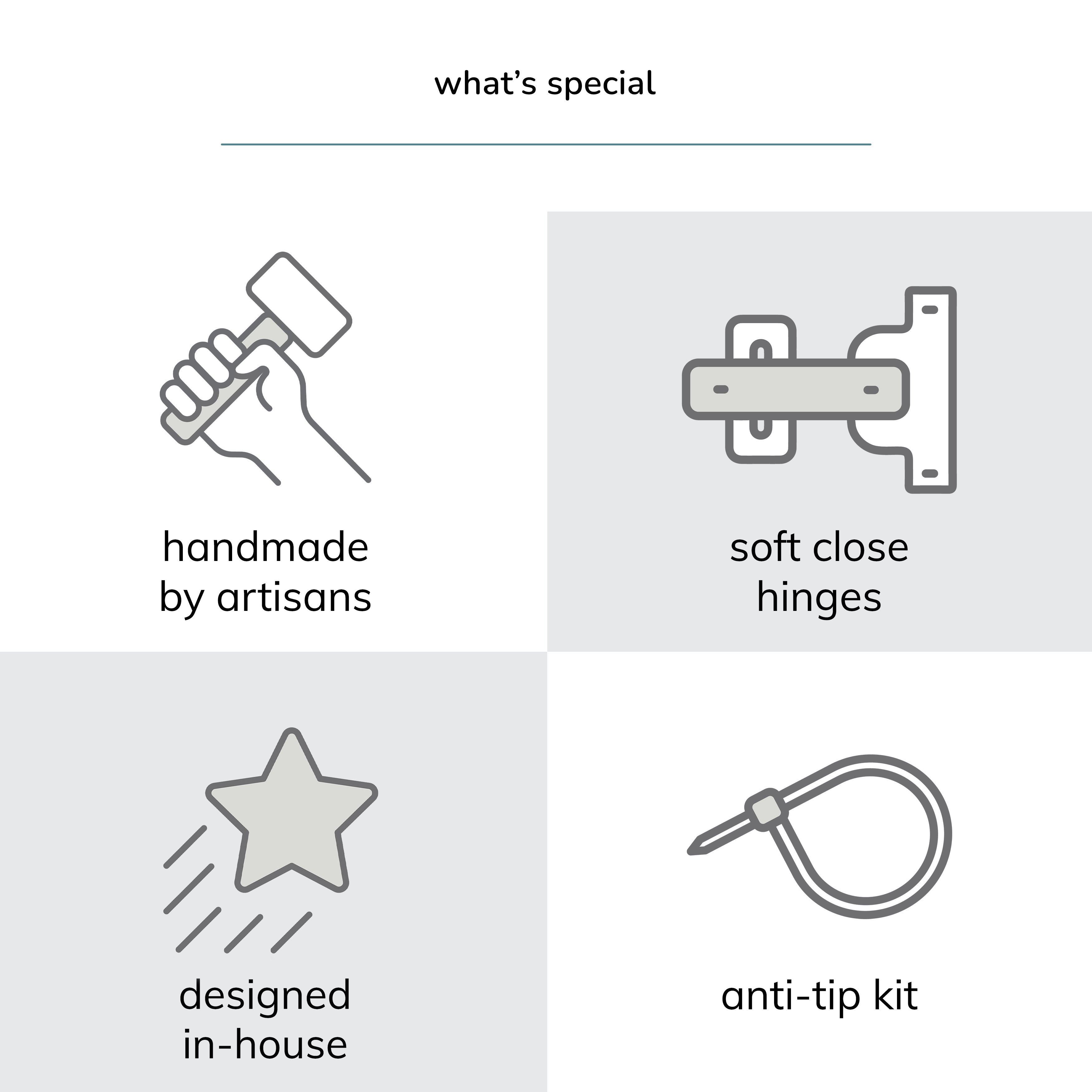 - Comes fully assembled - just attach the knobs.
