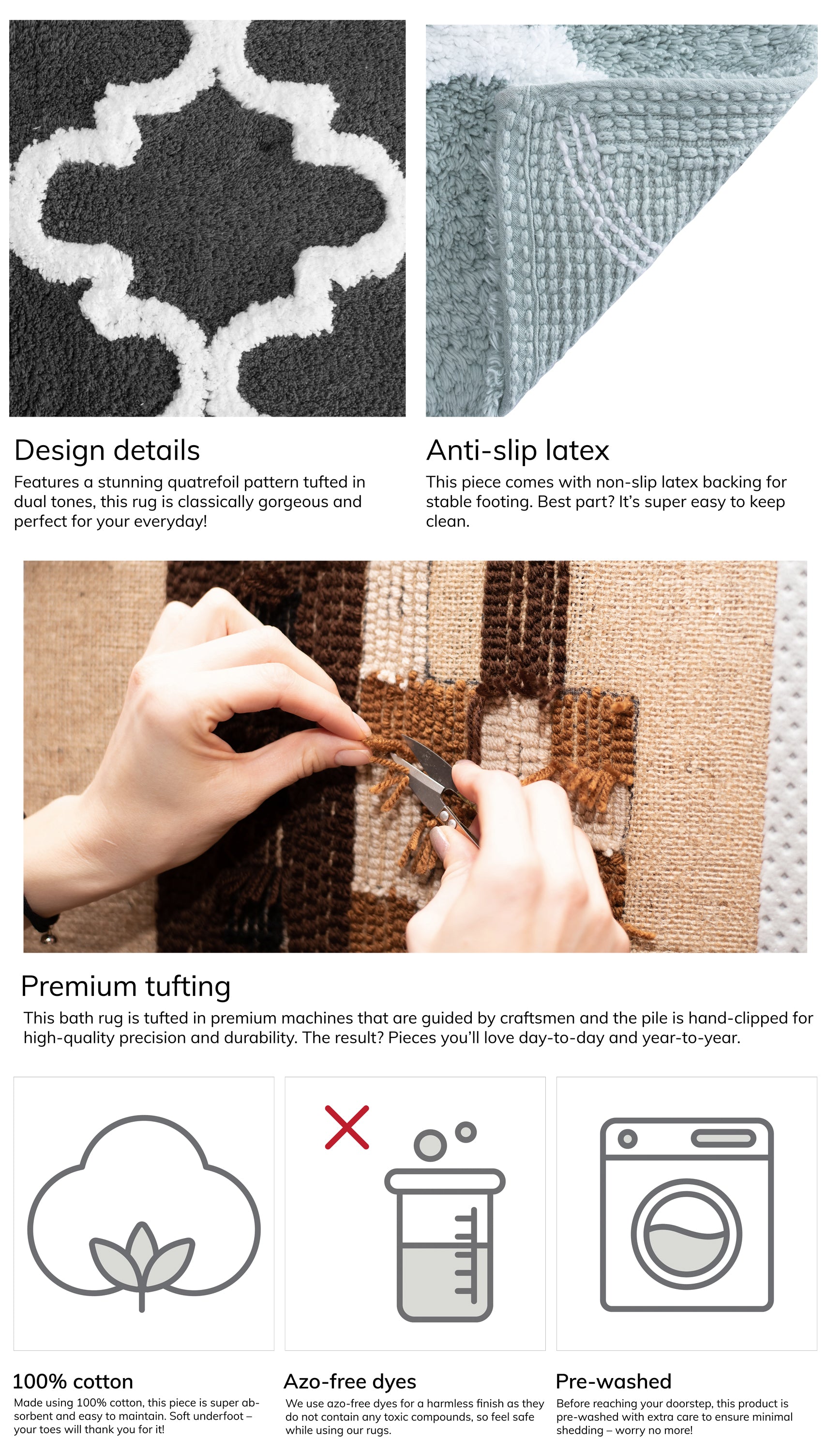 Step onto luxury. 100% cotton, super-absorbent, soft underfoot- all high-end traits. One side features a stunning quatrefoil pattern tufted in dual tones, the other has a non-slip latex backing for stable footing. It's perfect for your everyday life!