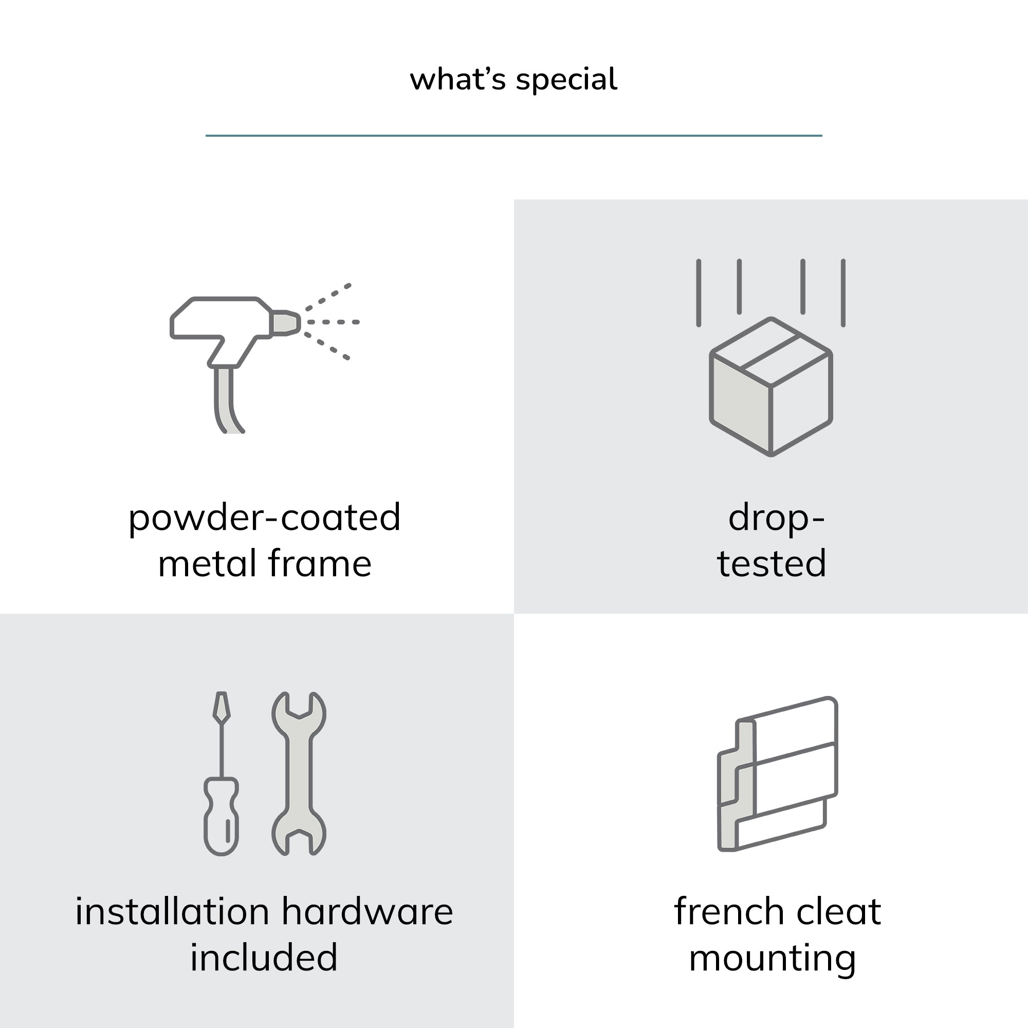Introducing a mirror that is a blend of modern silhouette, versatile functionality & superior craftsmanship. Made using premium metal all over, it features a rounded-rectangle frame paired with a built-in shelf that holds your go-to-essentials or displays. Comes with a pre-installed French cleat for easy mounting. Simple in design and handy in use, this piece looks good in any entryway, livingroom, or bedroom.