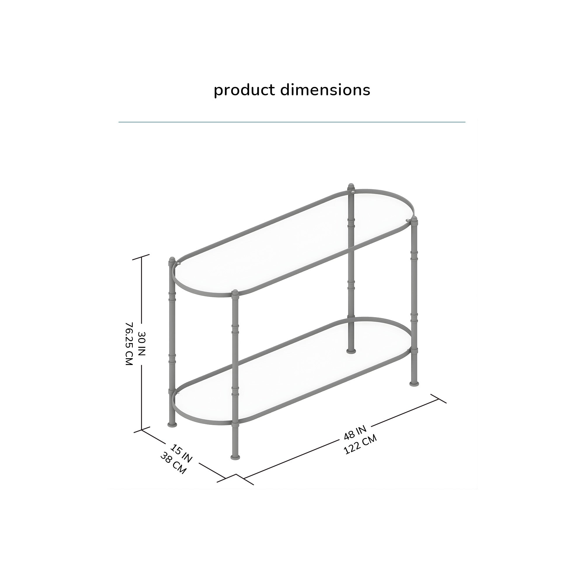 With a sculptural silhouette inspired by mid-century style and Art Deco design, this console table brings effortless elegance and architectural structure to any interior. The oblong shelves are crafted from premium tempered glass, paired with electroplated tubular metal legs for lasting durability and a refined finish. Its dual-shelf layout provides ample space for keys, decor accents, candles, or vases, while the tool-free assembly ensures a quick, hassle-free setup.